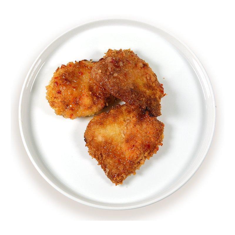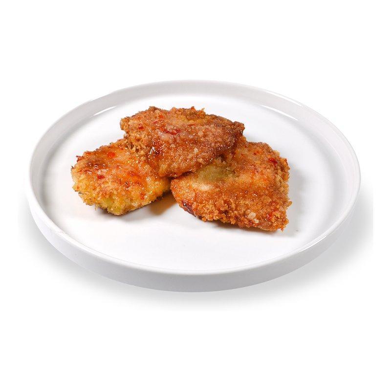 Состав продукта: свинина охлажденная карбонад, панировочные сухари панко(мука пшеничная, глюкоза, кукурузный крахмал, масло пальмовое, дрожжи хлебопекарные, соль, порошок соевый, вещества для обработки муки Е516 Е517), масло подсолнечное рафинированное дезодорированное, яйцо куриное, соус чили сладкий (сахар, вода, перец чили 22%, соль, чеснок, кукурузный крахмал, регулятор кислотности уксусная кислота, загуститель ксантановая камедь), мука пшеничная высший сорт, соль поваренная пищевая.