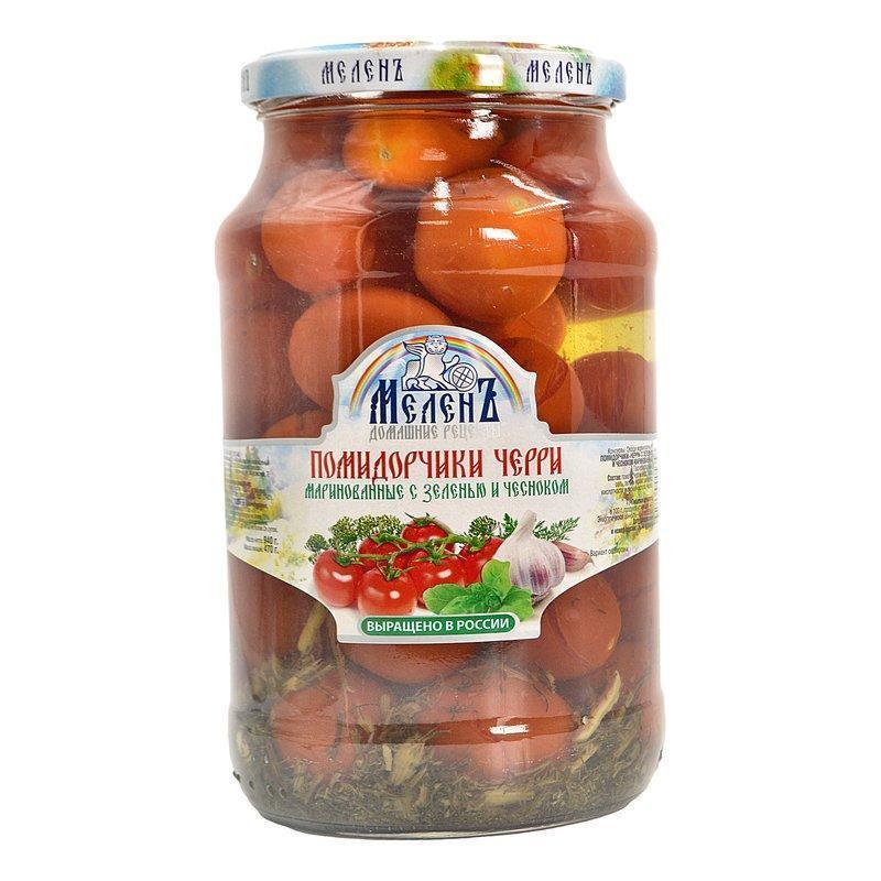 Помидорчики Мелен черри маринованные с зеленью и чесноком 940г