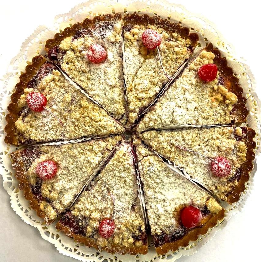 Состав продукта: начинка вишнёвая п/ф ( вишня быстрозамороженная, творожная масса(творог(молоко сухое обезжиренное, масло сливочное, вода, молокосвертывающий ферментный препарат животного происхождения, закваска), сахар, ароматизатор ванилин идентичный натуральному), сахарный песок, яйцо куриное), тесто песочное бездрожжевое(мука пшеничнея высший сорт,маргарин(рафинированные дезодорированные растительные масла в натуральном и модифицированном виде, в том числе соевое: вода, эмульгаторы: эфиры полиглицерина и жирных кислот, моно- диглицериды жирных кислот. соль, сахар, консервант сорбат калия, регулятор кислотности лимонная кислота, ароматизатор, краситель бета-каротин, антиокислители: аскорбиновая кислота, альфа-токоферол),сахарный песок, яйцо куриное, сода пищевая Е500), конфитюр вишня(сахар,вишня,вода,стабилизатор Е1442,Е418,регулятор кислотности Е330,Е331(iii),ароматизатор натуральный,консервант Е202), крошка овсяная п/ф( мука пшеничная хлебопекарная высший сорт, маргарин(рафинированные дезодорированные ра