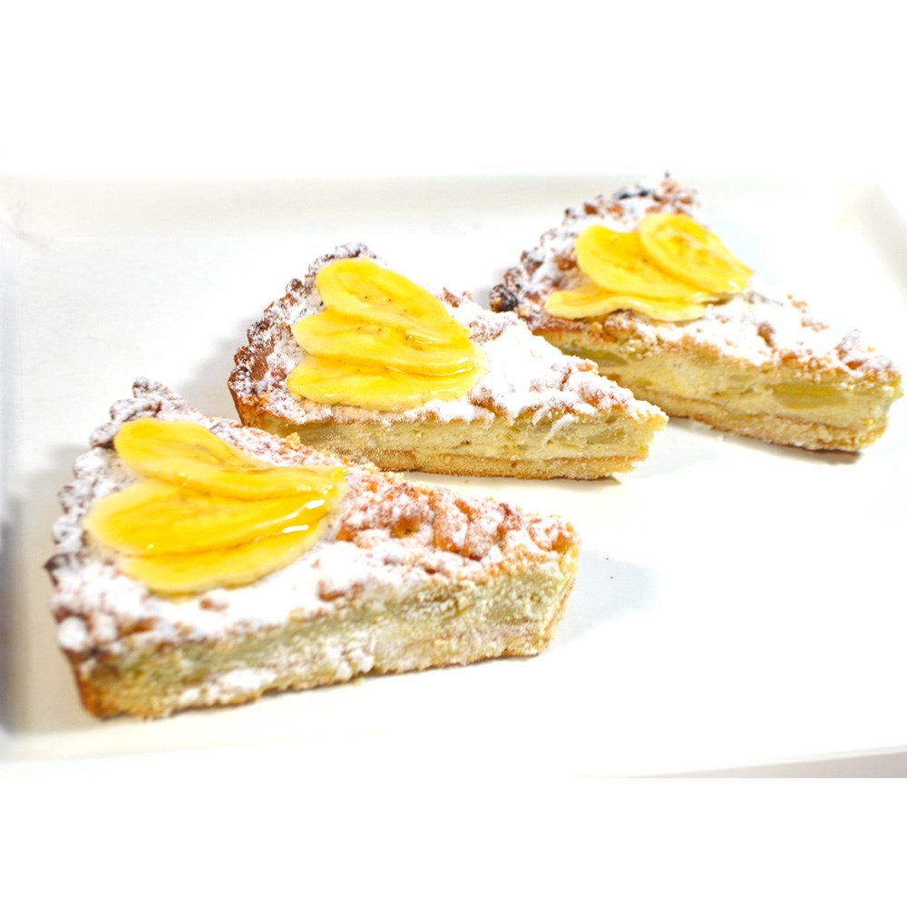 Состав продукта: тесто песочное бездрожжевое(мука пшеничнея высший сорт,маргарин(рафинированные дезодорированные растительные масла в натуральном и модифицированном виде, в том числе соевое: вода, эмульгаторы: эфиры полиглицерина и жирных кислот, моно- диглицериды жирных кислот. соль, сахар, консервант сорбат калия, регулятор кислотности лимонная кислота, ароматизатор, краситель бета-каротин, антиокислители: аскорбиновая кислота, альфа-токоферол),сахарный песок, яйцо куриное, сода пищевая Е500), начинка творожная( творожная масса(творог(молоко сухое обезжиренное, масло сливочное, вода, молокосвертывающий ферментный препарат животного происхождения, закваска), сахар, ароматизатор ванилин идентичный натуральному), сахарный песок, яйцо куриное, ванилин), бананы свежие, яйцо куриное, сахарный песок, сахарная термостабильная пудра(сахарная пудра(сахар белый свекловичный категории ТС2),жир растительный,масло рапсовое), масло растительное, декор вафельный цветок(кукурузный крахмал, вода, маргарин, натуральный крас