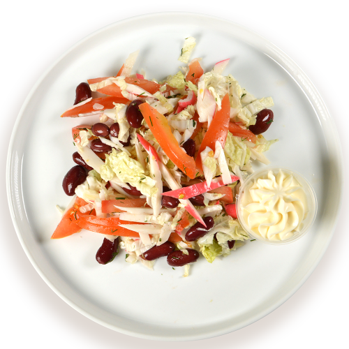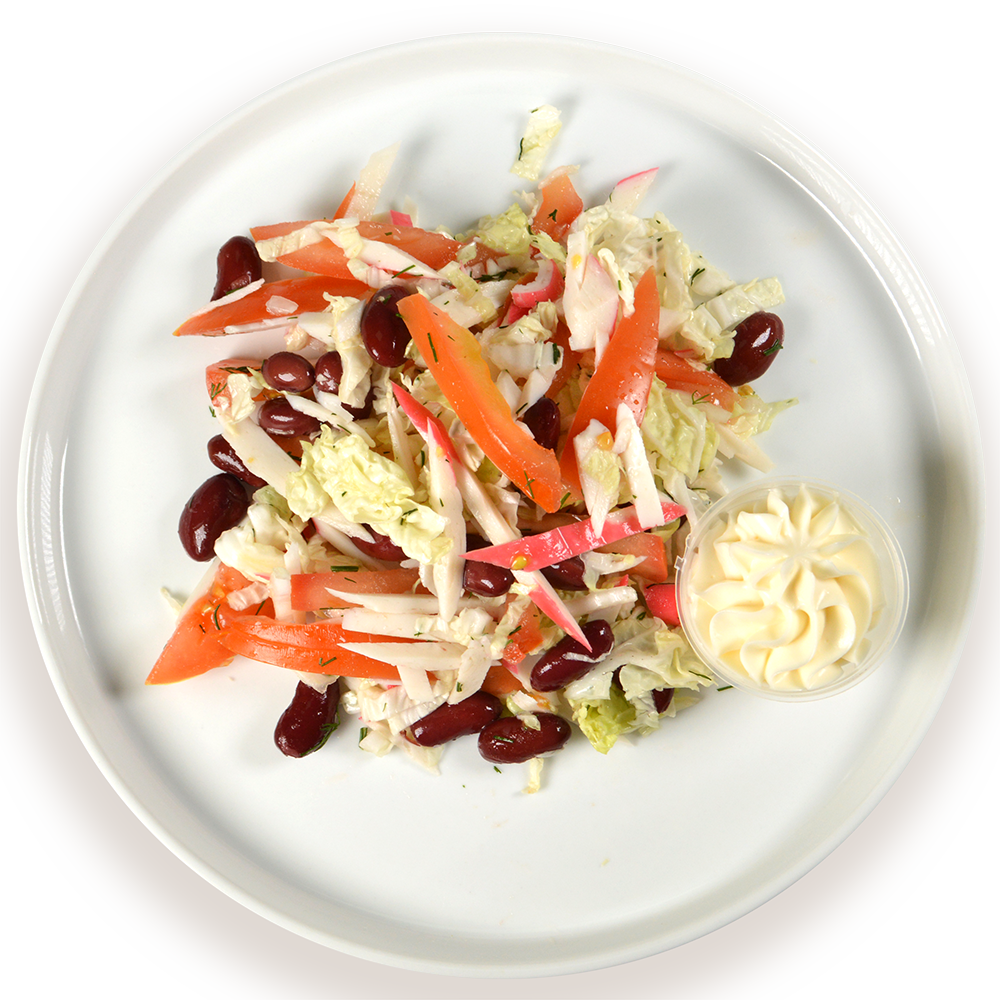 Состав:крабовые палочки,помидоры св, китайская капуста,майонез,перец,фасоль консер, Пищеваяи энерг.ценность в 100г продукта: белки–1,8г; жиры–12,4г; углеводы-5,8г. Калорийность142 ккал, кдж 594 Срок годности и условия хранения: при t4+,-2 град.С - 12 час ЕАС