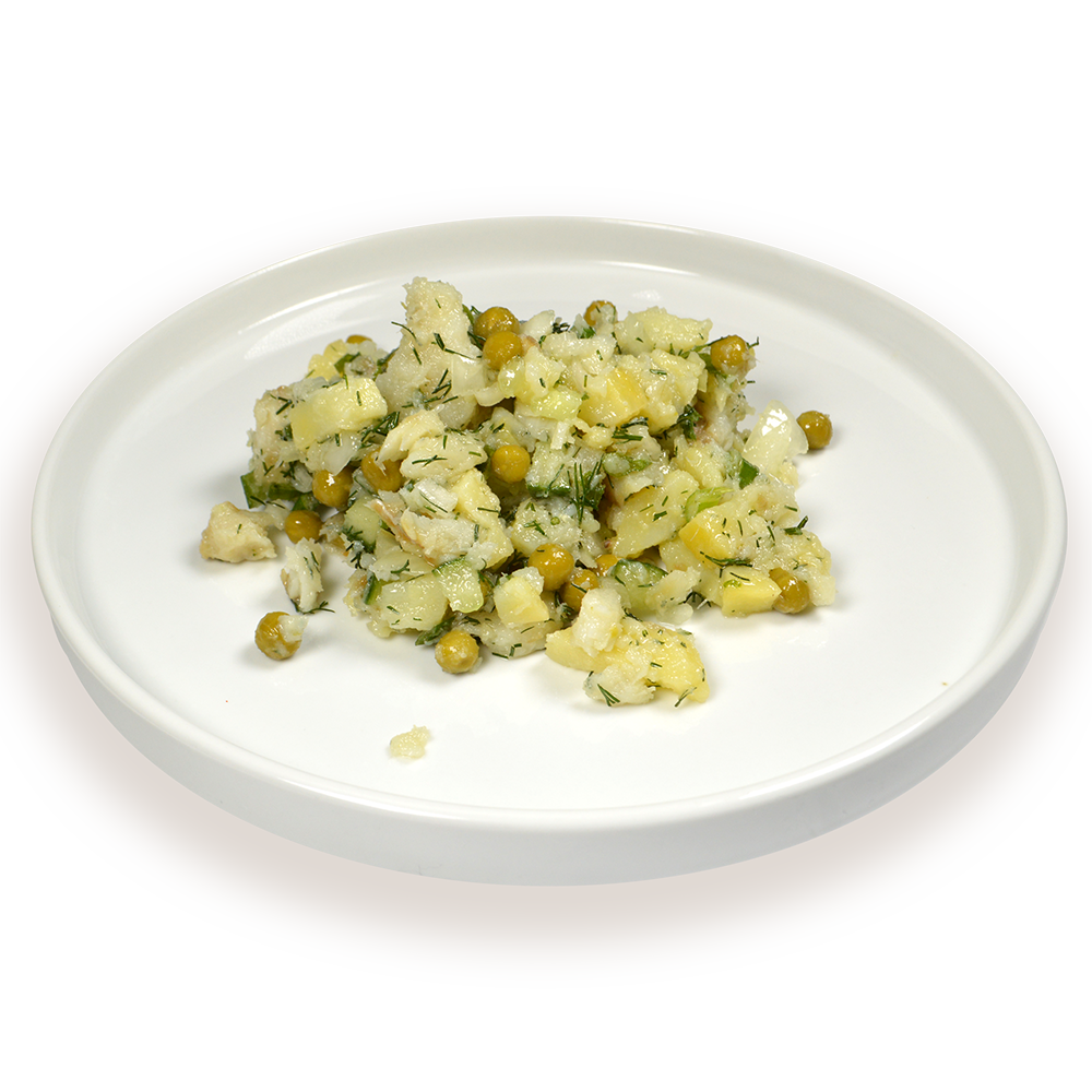 Состав: картофель,минтай,масло рас.,огурцы св., горошек конс.,лук реп.,лук зел.,укроп,специи Пищевая и энергетическая ценность в 100г продукта: белки-5,8г.жиры–13г.углеводы–6г.Калорийность: 170 ккал/711 кДж Срок годности и условия хранения: при t 4+/-2°С-12 часов ЕАС