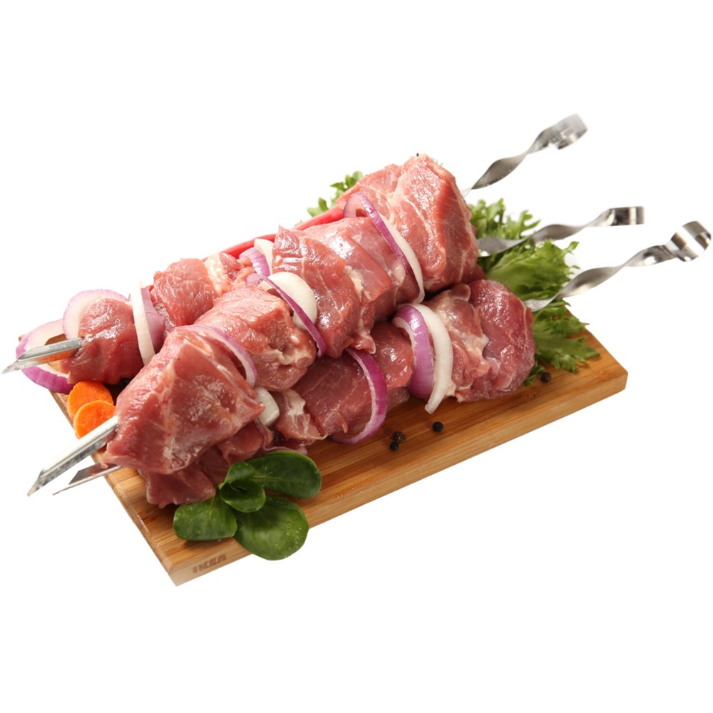 Состав продукта: свинина охлаждённая, лук репчатый, уксус пищевой 9%, соль поваренная пищевая, приправа к мясу (кориандр, куркума, паприка, хмели-сунели), перец черный молотый.