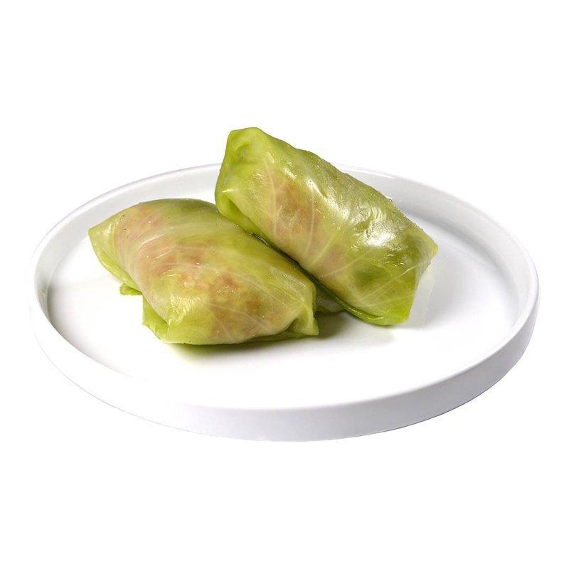 Состав продукта: капуста белокочанная, говядина охлажденная бескостная, свинина охлажденная бескостная, рис отварной, лук репчатый, масло подсолнечное рафинированное дезодорированное, соль поваренная пищевая, перец серный молотый.